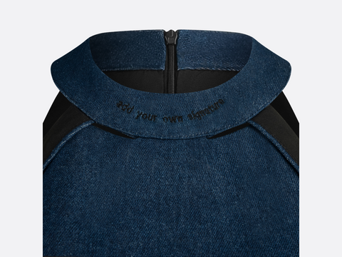 Với phong cách thanh lịch và độc đáo, chiếc đầm chữ A này là điểm nhấn đáng chú ý trong bộ sưu tập. Nổi bật rực rỡ với chiếc đầm là chi tiết cánh bướm tinh tế được tạo bằng kỹ thuật patchwork kết hợp với phong cách gấp giấy Origami. Tạo ra hoàn toàn từ vải Denim tái chế, việc sử dụng vải vụn để tạo chi tiết cánh bướm làm cho sản phẩm trở nên độc đáo và thu hút hơn bao giờ hết.